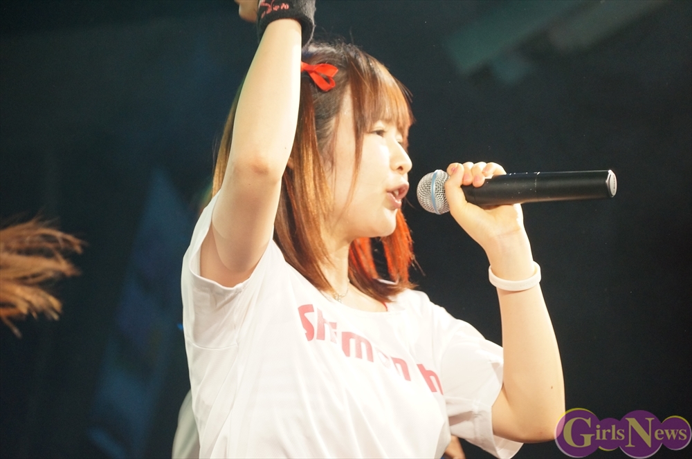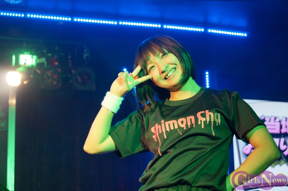 2番目の登場は茨城県下妻市出身、「アイドル界の未確認生命体」こと しもんchu。この日は大里唯、山田麻里子、嶋村詩織、池田美咲の4人が出演し、MC中に「爪跡を残して帰りたい」と意気込みを述べたしもんchuだが、全3曲のステージはその宣言通りの濃い内容となる。一曲目はゴールデンボンバー「女々しくて」のカバー。盛り上がる定番といえるこの曲でのスタートに、観客も湧いた。残り2曲はオリジナル曲。新曲の「KAKASHI」は、タイトルの案山子のように片足を上げる振り付けが印象的だ。そして最後の「家までダッシュ」、この曲の長さはたったの1分半。インパクトのある締めくくりに、観客は最後まで驚かされ続けた。そんなしもんchuは、地元下妻市の楽器店で毎月定期公演を行っている。一度足を運んでみてはいかがだろうか。