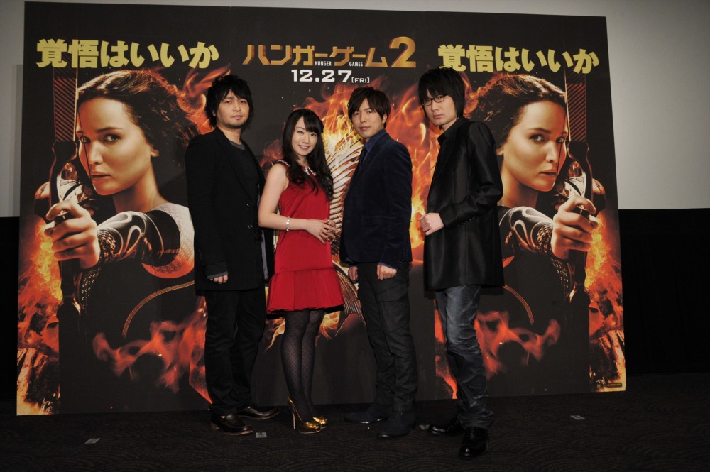 12月21日(土)、世界中で大ヒットした『ハンガー・ゲーム』シリーズ待望の第2弾『ハンガー・ゲーム2』の日本語吹替え版舞台挨拶イベントが東京・TOHOシネマズ六本木にて行われた。吹替え声優として前作から引き続き主人公カットニス・エバディーン(ジェニファー・ローレンス)役を演じる水樹奈々さん、カットニスと共に生き残り、彼女に恋するピータ(ジョシュ・ハッチャーソン)役の神谷浩史さん、主人公の幼馴染ゲイル(リアム・ヘムズワース)役の中村悠一さん、そして新たなキャラクターであるフィニック(サム・クラフリン)役を演じる前野智昭さんが登壇。絶大な人気を誇る豪華な顔ぶれで、イベントチケットは発売開始1時間で完売!イベント中は終始笑いが起こるなど会場は大いに盛り上がりを見せた。
