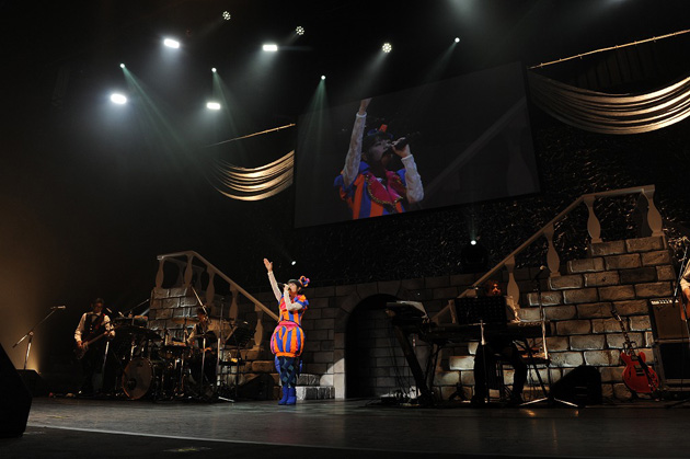 そして赤ずきんを脱いだ、白ワンピースに花をあしらった衣装。お城を脱走したクロレ姫をあやち姫が見事に演じている。バックバンドメンバーとのちょっとしたセリフのやり取り。その後に繰り出されたのはなんとアニソンメドレーだった。