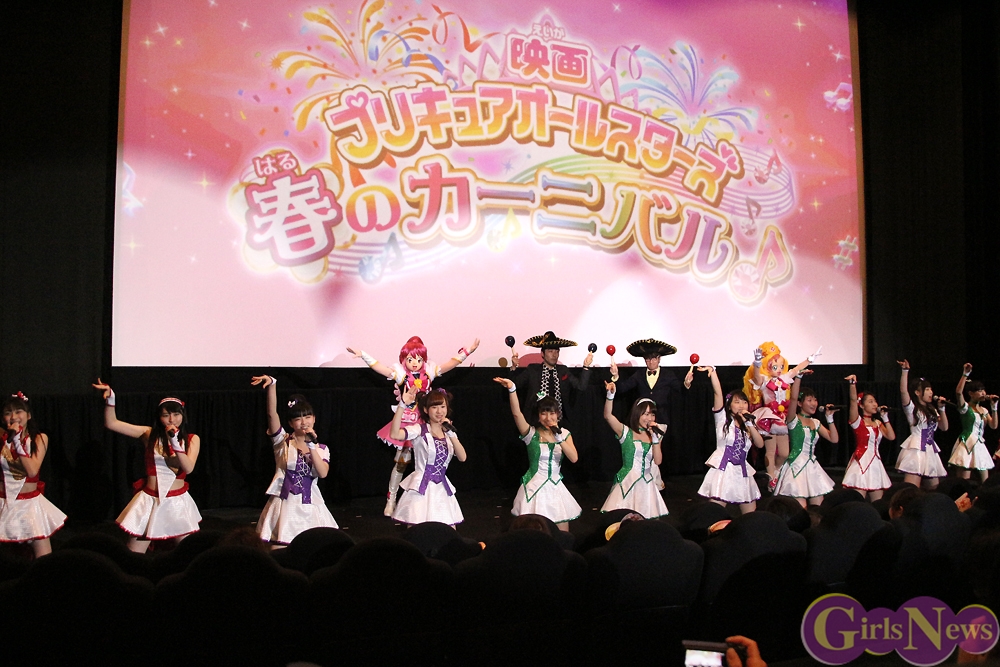 3月9日、「映画プリキュアオールスターズ 春のカーニバル♪」の完成披露舞台挨拶が新宿バルト9で行なわれ、声優の嶋村侑、浅野真澄、中島愛、潘めぐみ、ゲスト声優のオリエンタルラジオ(中田敦彦・藤森慎吾)、そして、主題歌を歌うモーニング娘。’15が登場した。
