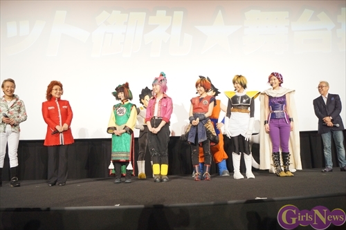 まずは声優陣とキャラクターが舞台の登場し、野沢雅子さんは孫悟空の声で「オッス! オラ悟空! 大ヒット、おめえたちがみんな観に来てくれるから嬉しいぞオラ! 今日で終わりじゃないねぇからな! これからもヨロシクな!」と挨拶。