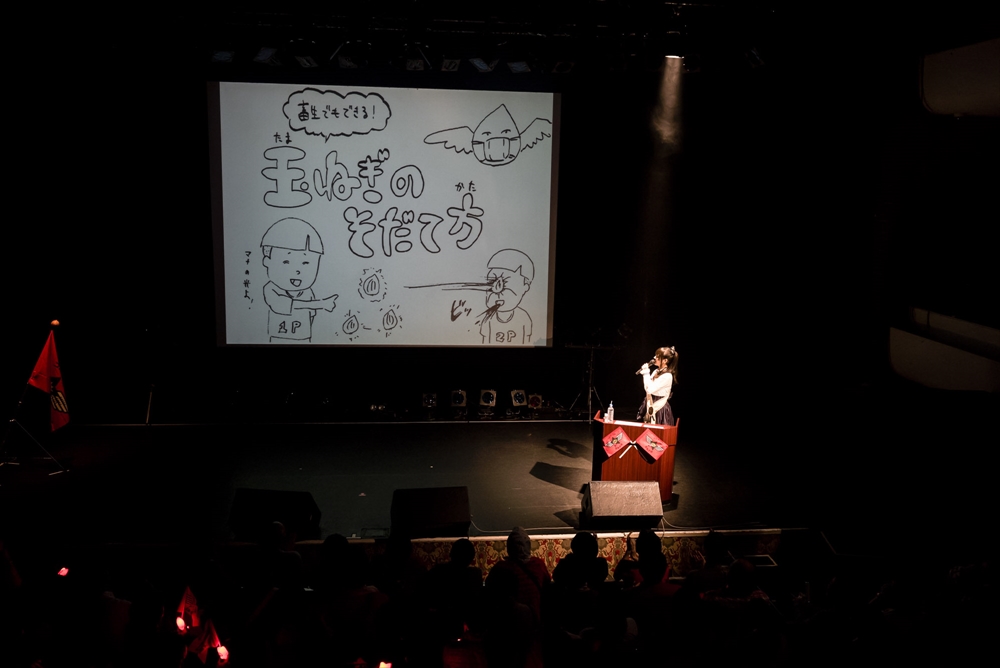 “開墾記念式典”には1200人の“同志”(ファンの総称)が集結し、イベントのオープニングでは「コルホーズの玉ねぎ畑」の代表である上坂の呼びかけで、“同志”と生産者の心得を唱和し、乾杯。その後、開場時に同志から「ご意見箱」によせられたご意見を紹介し、今年4月1日に設立されたばかりの同ファンクラブの今後の内容や、グッズに関するトークがなされた。