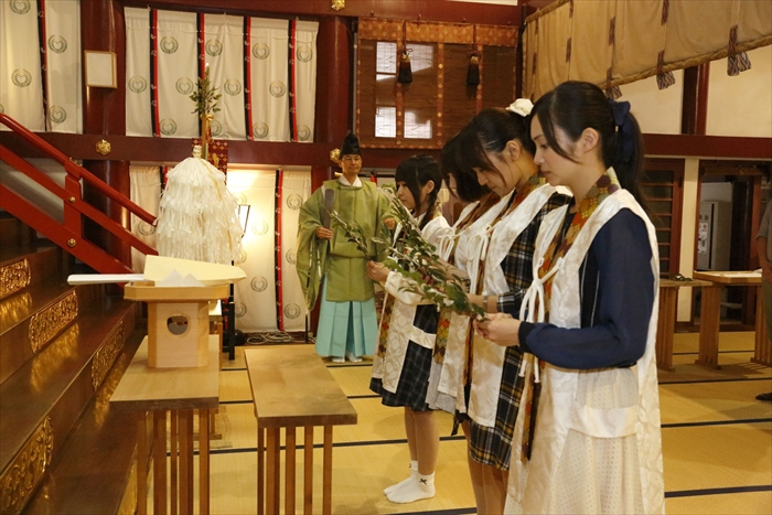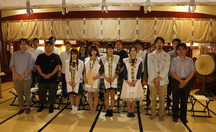 厳粛な雰囲気の中、ボイスキャストの4人と番組関係者たちが10月から放送されるアニメ「温泉幼精ハコネちゃん」の成功を祈願。