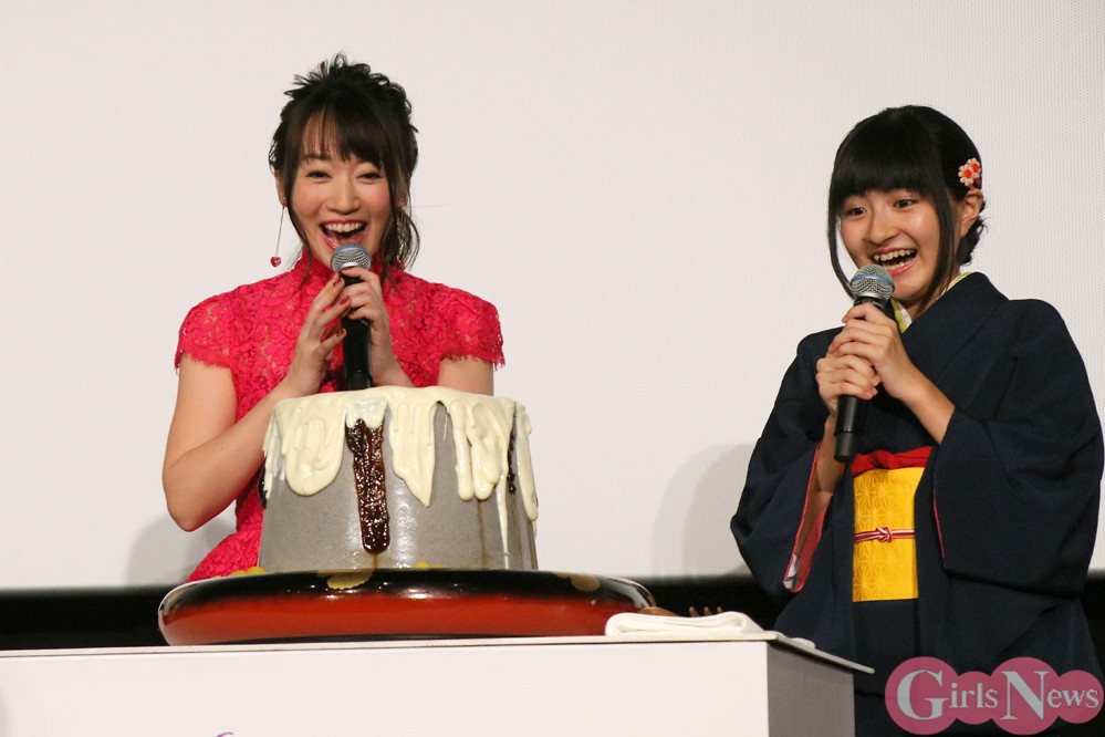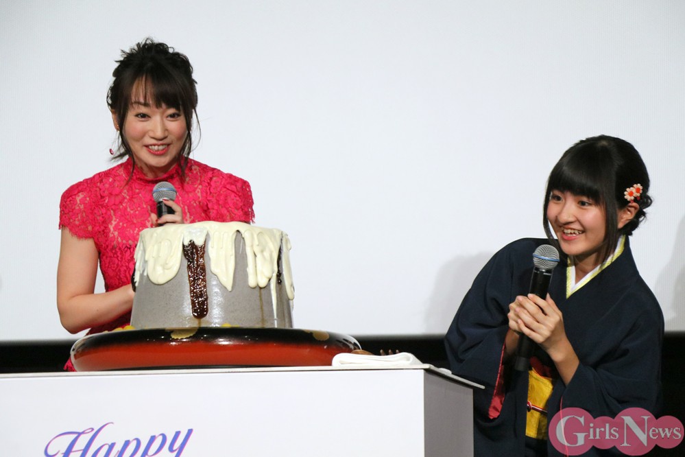 イベントの途中では、9月生まれの小林さん、鈴木さん、ホランさんの誕生が近いことから、作品中に登場した“露天風呂プリン”がバースデーケーキの代わりに登場した。笑顔で試食した小林さんたちは、さらに高坂監督から直筆の似顔絵をサプライズでプレゼントされて大感激。小林さんは「一生のお宝にします!」と大喜びだった。