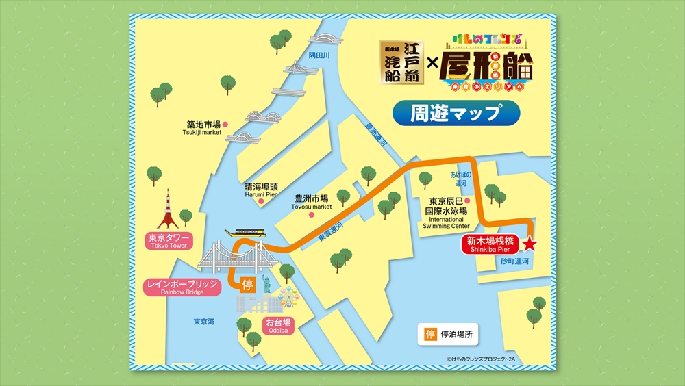 「けものフレンズ屋形船」は、新木場桟橋から発着し、お台場を周遊する2時間のコース。江戸情緒あふれる屋形船で、ここでしか食べられないコラボフードと東京港の景色をフレンズたちと一緒に楽しめる。