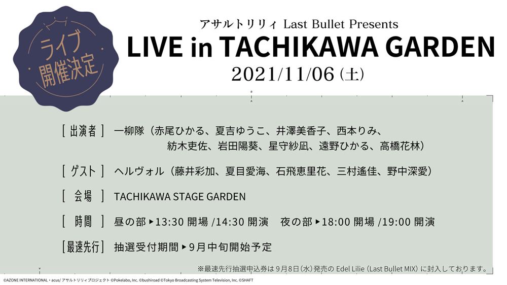 公演後には 11月6日(土)に開催するライブ「アサルトリリィ Last Bullet Presents LIVE in TACHIKAWA GARDEN」の新規情報が、アサルトリリィ公式ホームページ、公式ツイッターにて解禁された。チケットの最速先行抽選申込券は、 9月8日(水)にリリースされる『Edel Lilie(Last Bullet MIX)』に初回生産分限定特典として封入される。