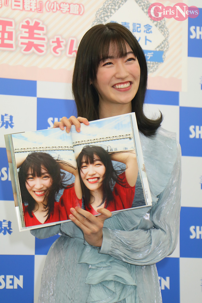 約8年ぶり、ソロ活動を開始してからは初の写真集。タイトルの『白群』について「白の中に透明な水色が入っている淡い色。幼いころから好きな色だったので、念願の3冊めの写真集のタイトルに使わせていただきました。今日の衣装も白群カラーです」と紹介。